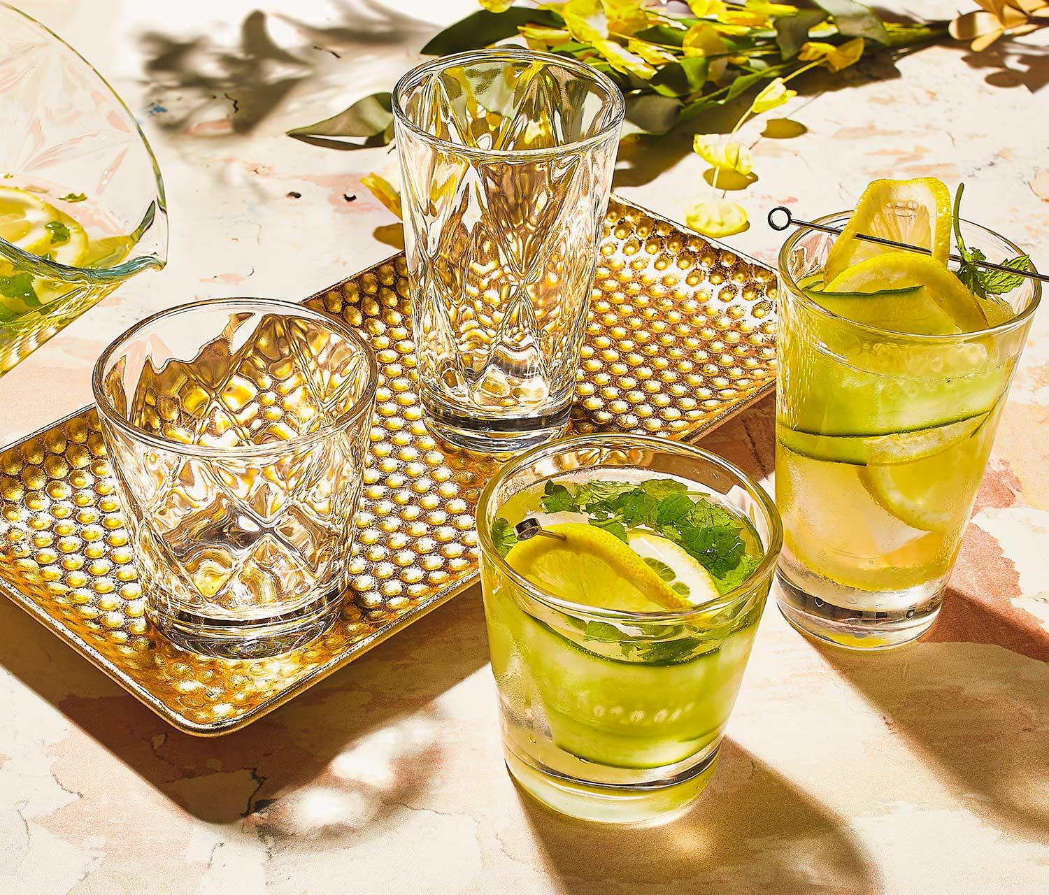 These cool crystal clear tall and low stackable glasses have a unique modern rhomboid diamond geometric dimensional pattern giving them a fun & contemporary vibe for your table and are perfect for serving your favourite juices & beverages or your fave cocktails.